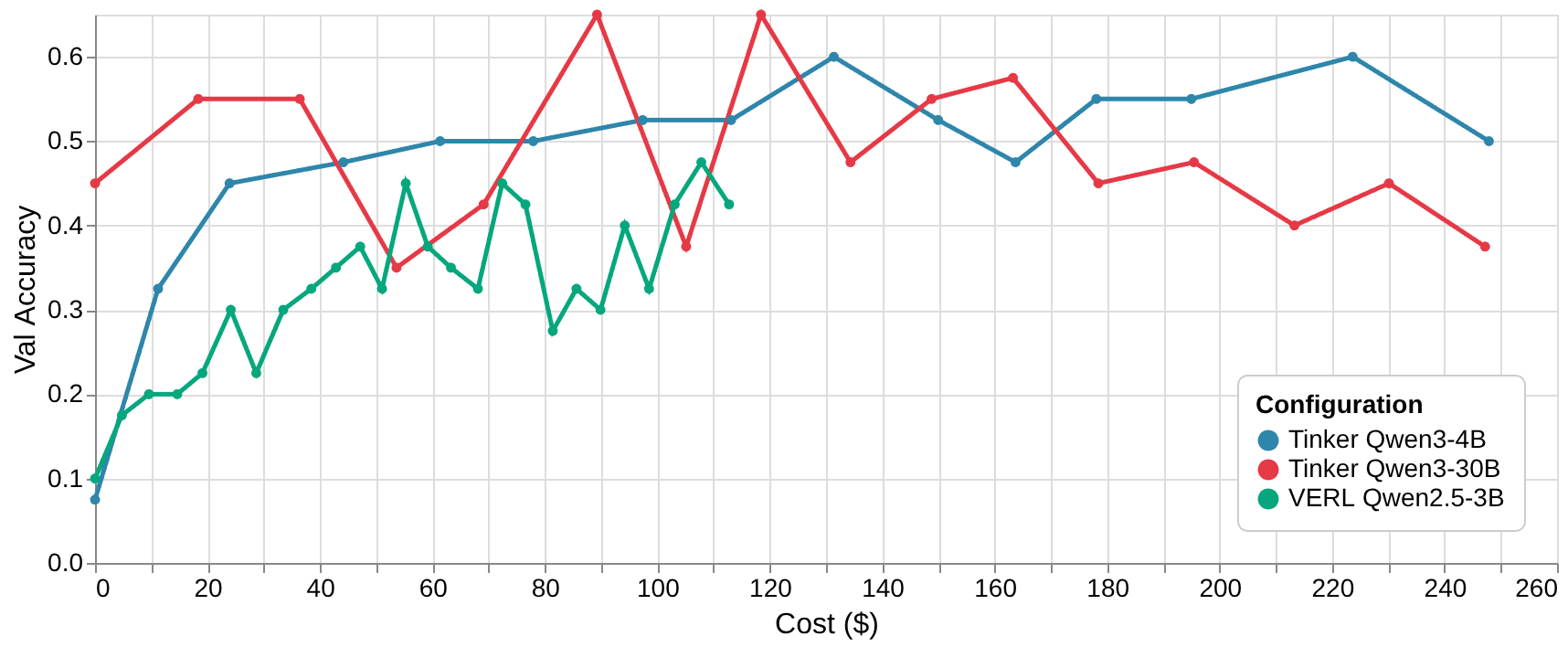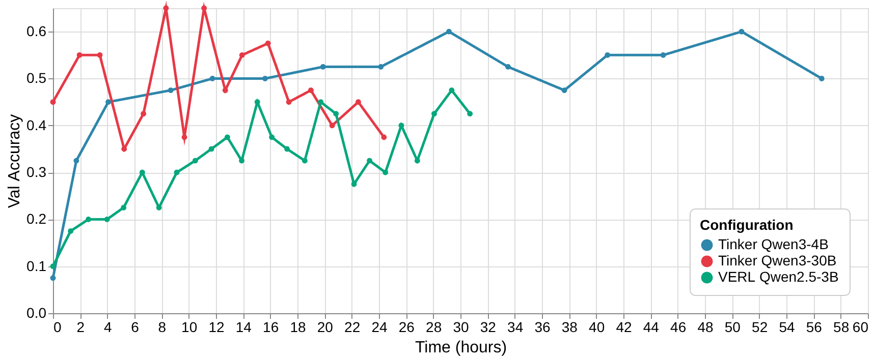 The results are telling. Both Qwen2.5-3B-Instruct (VERL) and Qwen3-4B-Instruct-2507 (Tinker) began at roughly 10% accuracy. However, the VERL-based model improved much more slowly, taking about 40 steps to reach 40% validation accuracy, and even after a late boost, it still underperformed compared to Qwen3-4B, which stabilized between 50%–60%.