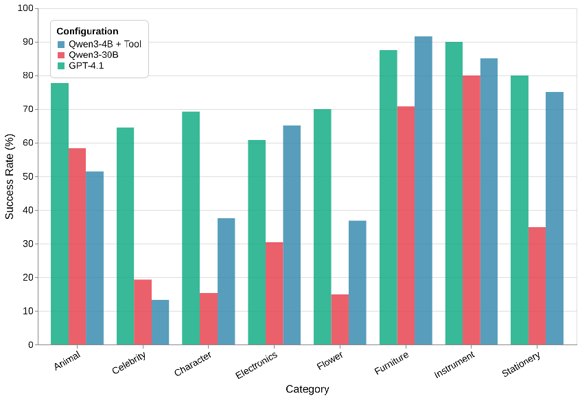 So instead, I created a custom dataset of 200 nouns with help from ChatGPT. During the process, I noticed that the agent’s success rate was highly dependent on the category of the object. For example, categories like animals and instruments were straightforward, while abstract concepts or geographical locations caused the model to struggle.
