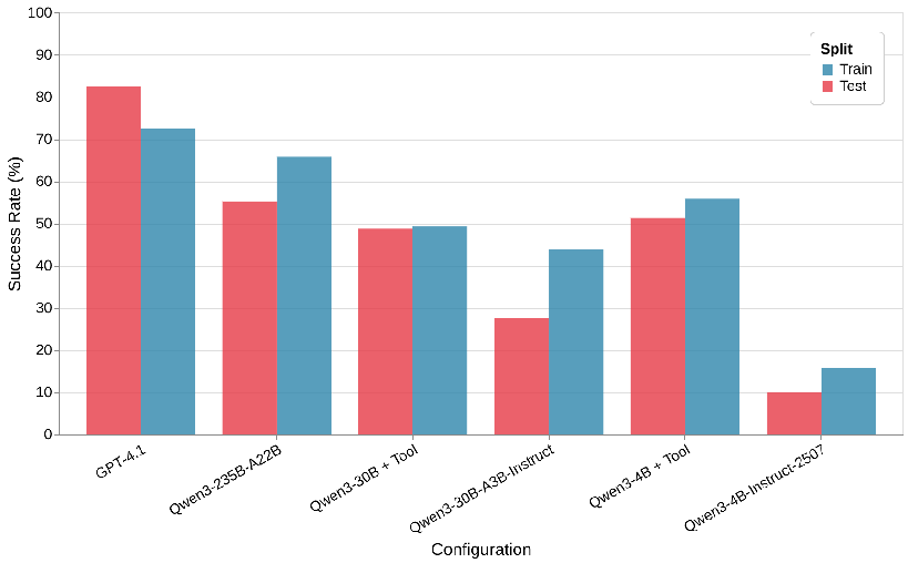 Now comes the most exciting part — the results. Let’s first look at how Qwen3-4B-Instruct-2507 and Qwen3-30B-A3B-Instruct-2507 perform as the player models after sufficiently long training, both without tool assistance.