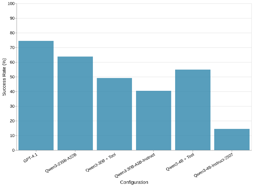 The answerer model was always GPT-5-mini (set to low reasoning effort). The search tool was mocked by GPT-4.1 — meaning weaker models could “use” GPT-4.1 as a “reasoning” tool if they figured out how (I told them it was a search engine, of course).
