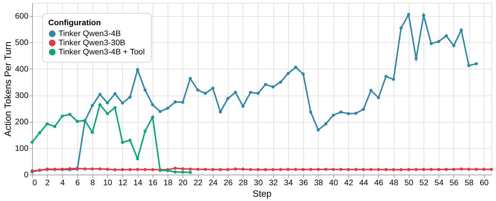The “I now can give a great answer.” has appeared in almost all actions when Qwen3–30B training hits the later stages. I suspect that’s why the training of that model fails to improve.