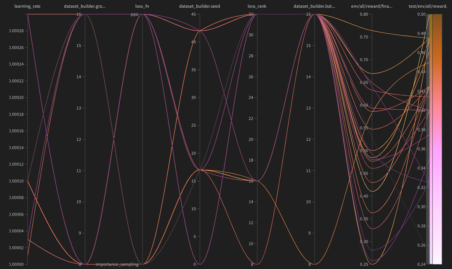 Ultimately, I plotted the results as a parallel-coordinate diagram, which revealed several immediate patterns: (1) Top-performing runs clustered around group_size = 16 and batch_size = 16. (2) High-reward runs tended to use LoRA ranks around 16. (3) The random seed had a major effect on convergence — seed 17 consistently yielded smoother optimization.